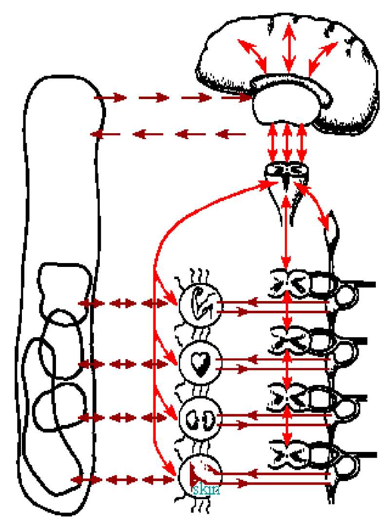 System 5 The Cortex. Higher brain functions. System 4 Diencephalon Input from senses, forward planning. System 3 Base brain. Pons and medulla. Internal regulation. Optimisation. System 2 The sympathetic nervous system. Its function is to stabilise the activity of muscles and organs. System 1 Muscles, organs. Primary activities.